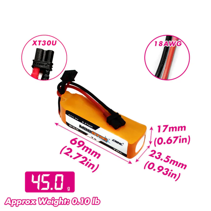 CNHL 3S lipo battery 550mAh 11.4v with XT30U plug is specially designed for Betafpv Pavo20 Pro FPV Drone.