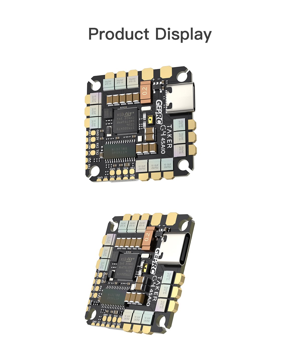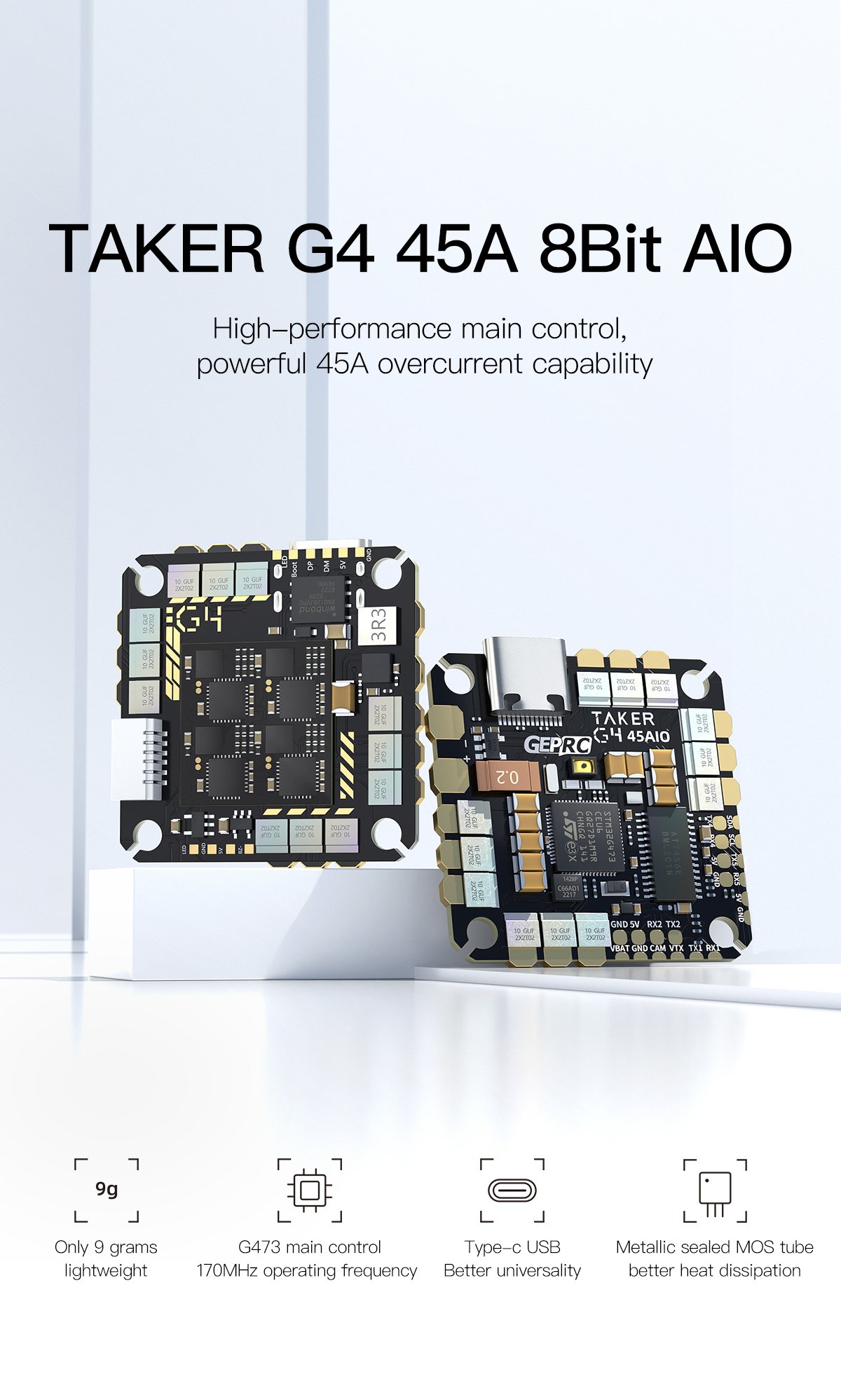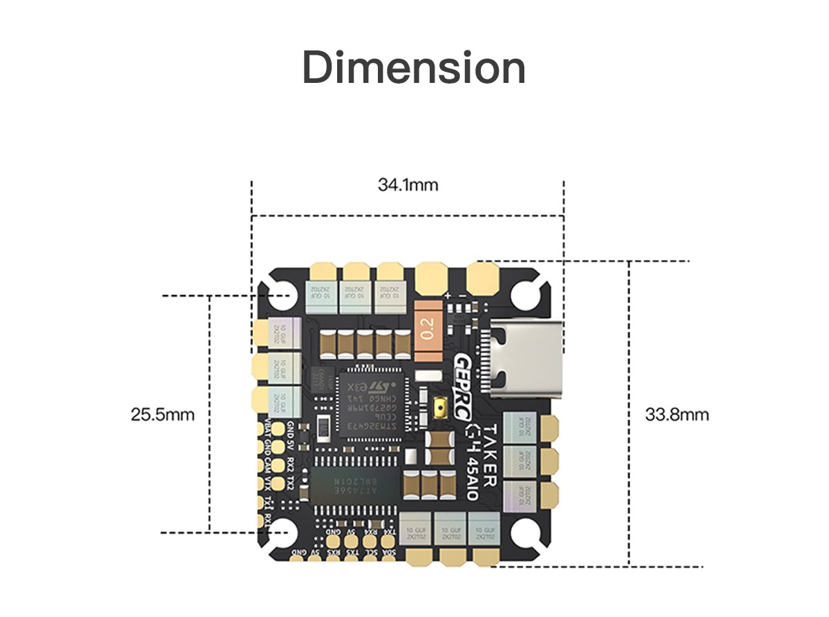The TAKER G4 45A 8Bit AIO, developed by the GEPRC team, features the advanced G473 flight controller for enhanced computing capability.