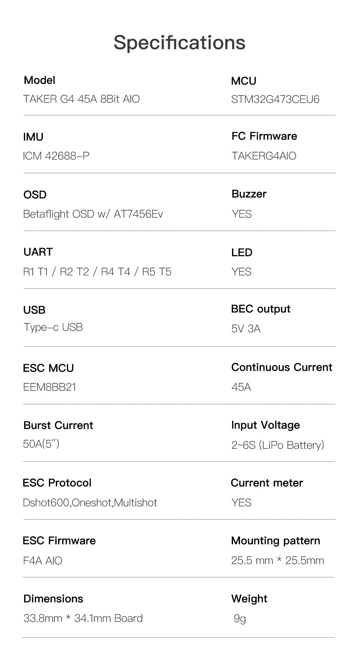 - Supports:Dshot600,Oneshot,Multishot