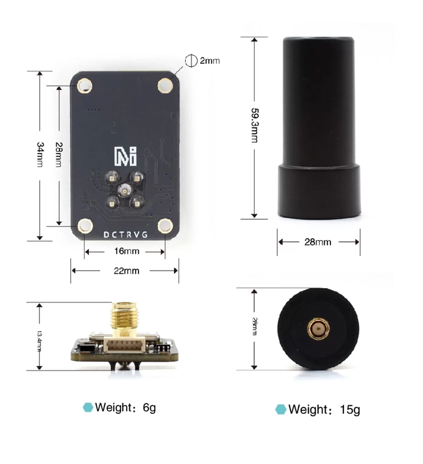 - Weight: 6g (without antenna); 21g (with antenna)